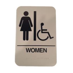 A.D.A. Sign, Women/Handicap, Rectangle, 6" Wide by 9" High, Raised Lettering, White on Tan