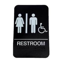 A.D.A. Sign, Women/Men/Handicap/Restroom, Rectangle, 6" Wide by 9" High, Raised Lettering, White on Brown