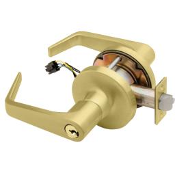 Grade 1 Electrified Cylindrical Lock, Storeroom Function, 12-24 VDC, Fail Safe, 2-3/4" Backset, Rhodes Lever, Satin Brass Finish